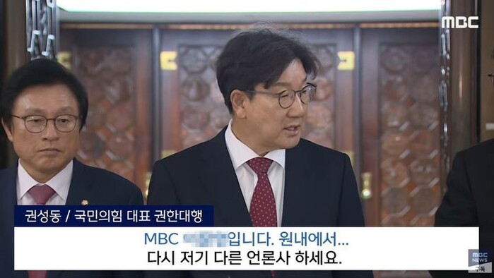 이에 MBC의 한 기자가 소속과 이름을 밝힌 뒤 "원내에서…"로 시작하는 질문을 하려고 하자 권 권한대행은 "다시, 저기 다른 언론사 하세요"라며 고개를 돌렸다.
