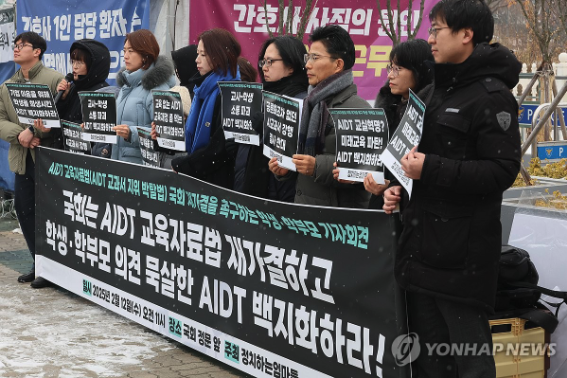 | ▲ 12일 인공지능디지털교과서(AIDT) 국회 재가결 촉구 학생·학부모 기자회견 (사진=연합뉴스) |