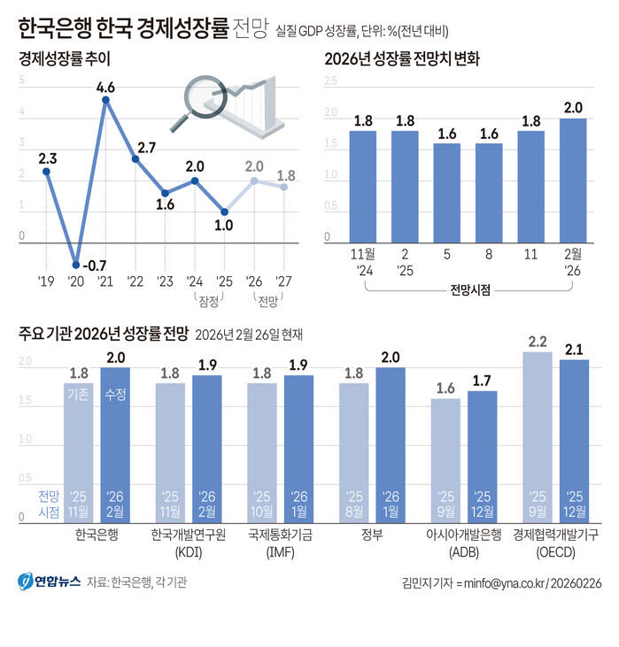 반도체 중심의 수출 증가세와 내수 회복 흐름을 반영한 결과다. 이번 전망치는 정부 전망치(2.0%)와 동일하며, 한국개발연구원(KDI)과 국제통화기금(IMF)이 제시한 1.9%보다 높다. 다만 경제협력개발기구(OECD)의 2.2%와 주요 투자은행 평균 전망치(2.1%)보다는 낮다.