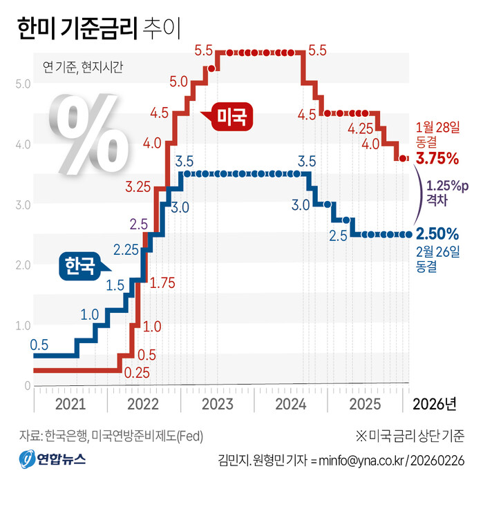 한은은 2024년 10월부터 완화 기조로 전환해 지난해 5월까지 네 차례(총 1.00%포인트) 금리를 인하했지만, 이후 7·8·10·11월과 올해 1·2월까지 여섯 차례 연속 금리를 묶었다.