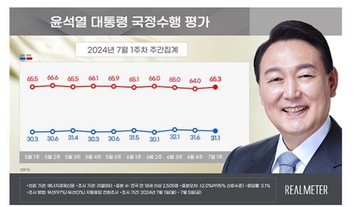 국정 수행 부정 평가는 1.3%p 상승한 65.3%로 조사됐다.