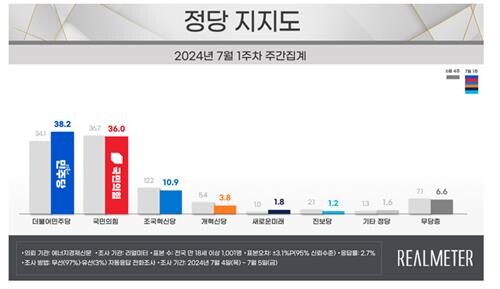 한편, 이달 4∼5일 전국 18세 이상 유권자 1천1명을 대상으로 진행한 정당 지지도 조사에서는 국민의힘 36.0%, 민주당 38.2%를 기록했다.