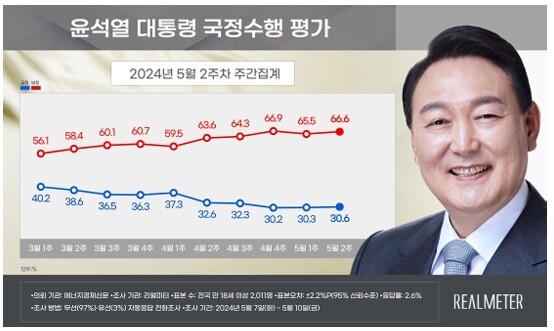 일주일 전 조사보다 오차범위 내인 0.3%p 오른 수치로 부정 평가는 1.1%p 상승한 66.6%로 조사됐다.