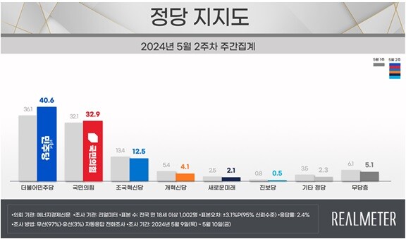 이밖에 조국혁신당 12.5%, 개혁신당 4.1%, 새로운미래 2.1%, 진보당 0.5%, 기타정당 2.3% 등이었다. 무당층은 5.1%로 조사됐다.