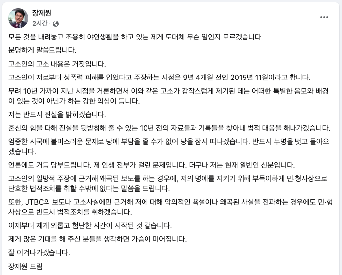 장 전 의원은 오늘 페이스북에서 "엄중한 시국에 불미스러운 문제로 당에 부담을 줄 수가 없어 당을 잠시 떠나겠다"며 이같이 말했다.
