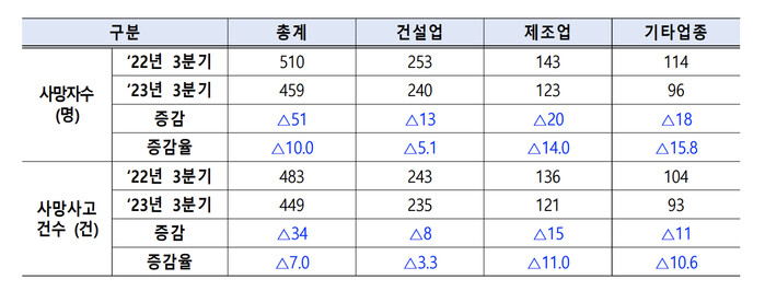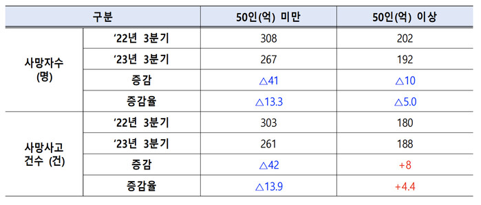 | ▲2023년 3분기에 발표된 재해조사 대상 사망사고 발생현황 잠정치 (자료=고용노동부) |