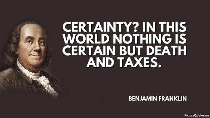 “세상에 확실한 것은 죽음과 세금뿐이다.”, “인간인 이상 아무리 노력해도 죽음은 피할 수 없고, 한 국가의 국민인 이상 아무리 애를 써도 세금을 피해 갈 수는 없다” 미국 건국의 아버지로 불리는 100달러 지폐 속 인물인 벤저민 프랭클린의 말이다.