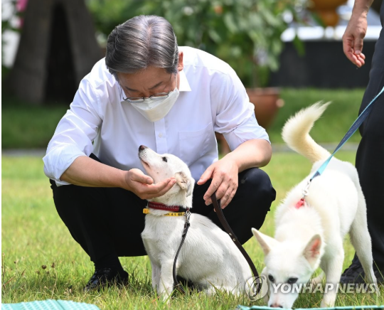 | ▲ 더불어민주당 이재명 대선 후보.사진은 당시 이재명 경기도지사가 농업기술센터 내 잔디밭에서 보호견 '오리'와 시간을 보내는 모습 2021.8.20 (사진=연합뉴스) |