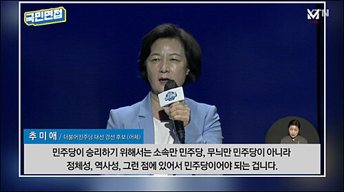 이에 대해 추미애 후보는 “제가 단정한 적 없다”며 “민주당이 승리하기 위해서는 소속만 민주당, 무늬만 민주당이 아니라 정체성, 역사성이 민주당이어야 된다”고 답했다.