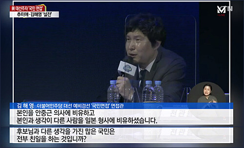 관련해 김해영 전 의원은 전날 청주 CJB컨벤션센터에서 열린 ‘국민면접’ 행사에서 추미애 후보에게 “면접관에 불만을 제기하는 것은, 면접 받는 사람의 기본적인 자세가 아니라는 지적이 있다”고 질문했다. 또 김 전 의원은 “본인을 안중근 의사에 비유하고, 본인과 생각이 다른 사람을 일본 형사에 비유했다”며 “후보님과 다른 생각을 가진 많은 국민은 전부 친일을 하는 것인가”라고 따져 물었다.