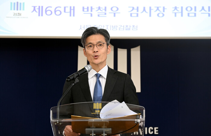 | ▲ 박철우 신임 서울중앙지검장이 21일 서울 서초구 서울중앙지방검찰청에서 열린 제66대 서울중앙지방검찰청 검사장 취임식에서 취임사를 하고 있다. 2025.11.21 (사진=연합뉴스) |