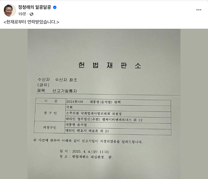더불어민주당 소속 정청래 국회 법제사법위원회 위원장은 1일 헌법재판소로부터 윤석열 탄핵심판 선고기일이 4일 오전 11시로 지정됐다고 밝혔다.