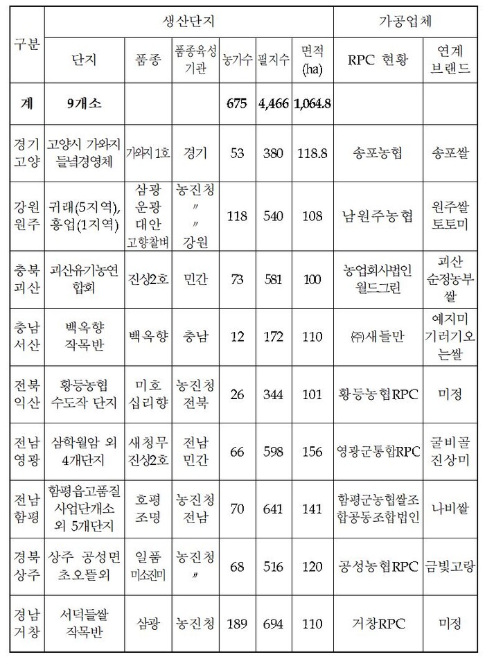 - 각 단지에서는 농촌진흥청, 도(道)농업기술원, 민간육종회사가 개발한 국내 육성 벼 가운데서 선정한 품종을 재배하고 있다.