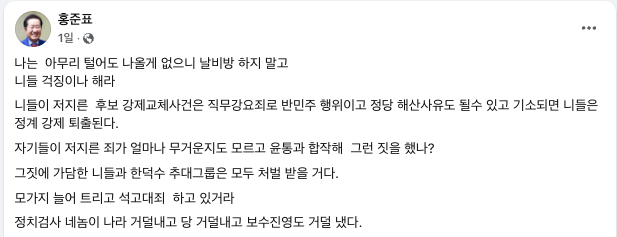 그는 전날에도 "나는 아무리 털어도 나올 게 없으니 날 비방하지 말고 너희들 걱정이나 해라"라며 "너희가 저지른 후보 강제교체사건은 직무강요죄로 반민주 행위고 정당해산사유도 될 수 있고 기소되면 정계 강제 퇴출된다"라고 국민의힘을 비판한 바 있다.