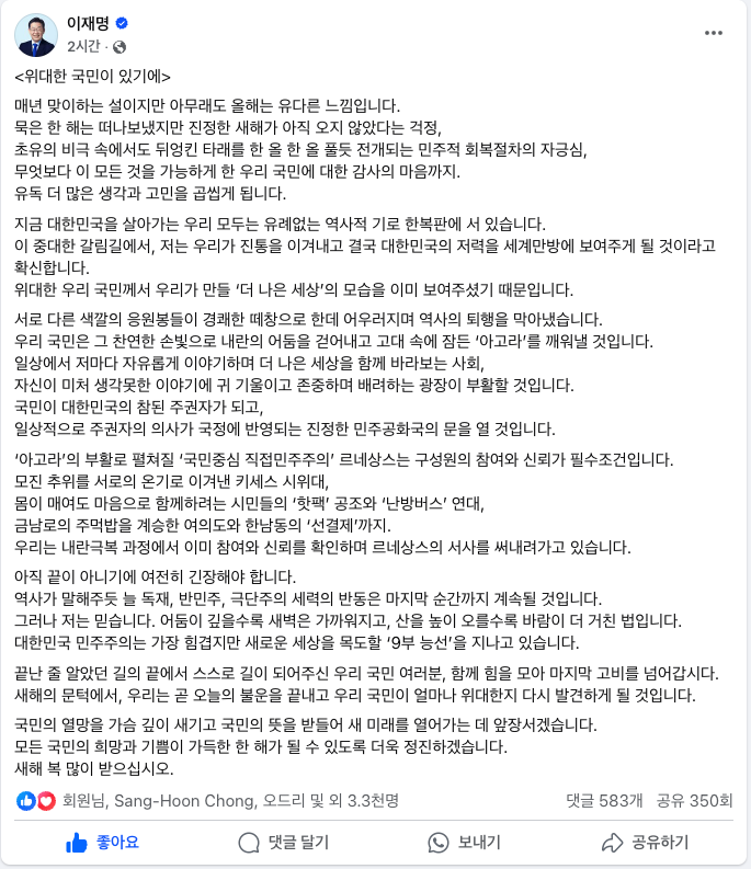 이 대표는 “끝난 줄 알았던 길의 끝에서 스스로 길이 되어준 우리 국민 여러분, 함께 힘을 모아 마지막 고비를 넘어가자”며 ”새해의 문턱에서, 우리는 곧 오늘의 불운을 끝내고 우리 국민이 얼마나 위대한지 다시 발견하게 될 것”이라고 밝혔다.