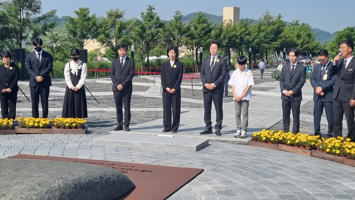 묘역 입구에는 윤석열 대통령, 문재인 전 대통령, 김진표 국회의장, 한덕수 국무총리, 국민의힘 황우여 비상대책위원장, 더불어민주당 이재명 당 대표 등 명의의 추모 화환이 줄지어 자리를 잡았다.