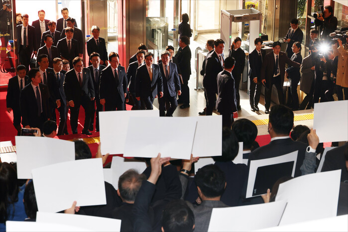 이 대통령은 잠시 고개를 숙여 인사한 뒤 곧바로 본회의장으로 향했다. 민주당 의석은 환호와 박수로 가득 찼지만, 전체 의석의 3분의 1에 해당하는 야당석은 텅 비어 있었다.
