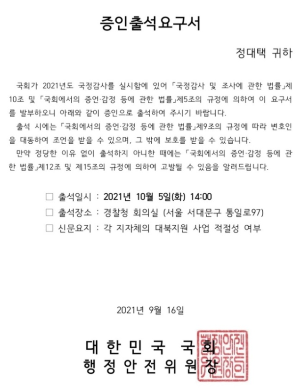 한편 당시 양당 원내대표까지 나서 '정대택 증인 철회'에 대해 논의했지만, 원만한 합의를 이루지 못해 경찰청 국감은 파행직전까지 갔었다. 그러나 국감 당일 정 씨 증인 철회와 야당 의원들이 쓰고 왔던 "대장동 특검 요구 마스크 교체하는 것으로 극적 합의" 하며 정 씨 행안위 국감 증인 채택은 무산됐었다.