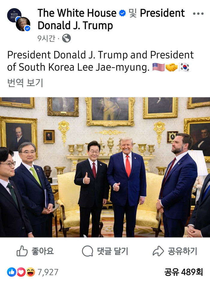 | ▲ 백악관은 25일(현지시간) 미국 워싱턴DC 백악관 오벌오피스에서 열린 이재명 대통령과 도널드 트럼프 대통령과의 한미정상회담 소식을 사회관계망서비스 페이스북을 통해 전했다. 2025.8.26 (사진=연합뉴스) |
