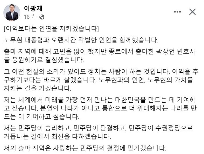 이광재 전 국회 사무총장이 종로 출마를 포기한다고 밝히면서 "종로에서 출마한 곽상언 변호사를 응원하기로 결심했다"고 밝혔다.