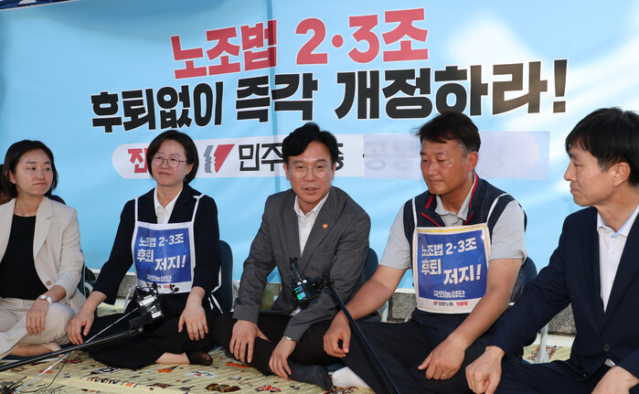 | ▲ 김영훈 고용노동부 장관이 25일 서울 여의도 국회에서 노조법2·3조 개정 촉구 농성장을 찾아 양경수 민주노총 위원장 등 참석자들과 대화하고 있다. 왼쪽부터 진보당 김재연 상임 대표, 진보당 정혜경 의원, 김영훈 장관, 양경수 민주노총 위원장, 사회민주당 한창민 대표. 2025.7.25 (사진=연합뉴스) |
