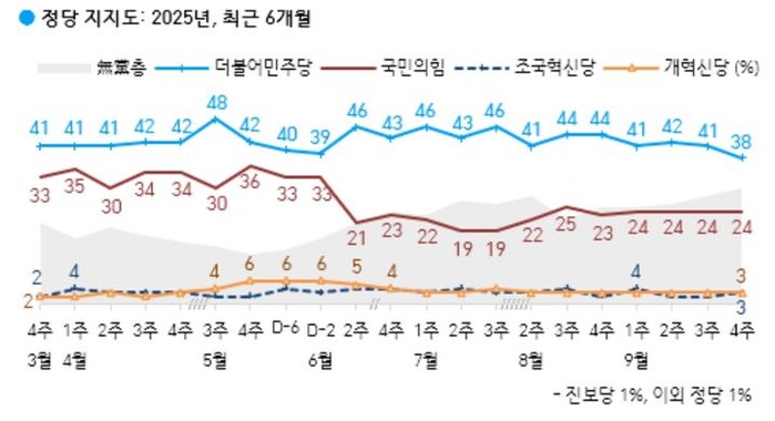 정당 지지도에서도 더불어민주당은 38%로 전주 대비 3%포인트 하락하며 30%대로 내려갔다. 국민의힘은 24%로 변동이 없었고, 개혁신당·조국혁신당은 각각 3%, 진보당 1%, 지지정당 없는 무당층은 30%로 증가했다.