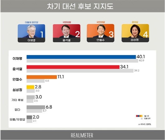 이재명 더불어민주당 대선 후보가 "다자 가상대결" 에서 윤석열 국민의힘 후보를 "오차범위 밖에서 앞서는 것" 으로 나타났다. 안철수 국민의당 후보는 11%대의 지지율을 기록하며 상승세를 보였다.