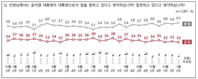 전국지표조사(NBS) 리포트 1월 2주차에서 윤석열 정부의 국정운영평가와 관련, 긍정 평가 32%, 부정 평가 61%로 60%대를 다시 넘은 것으로 나타났다.