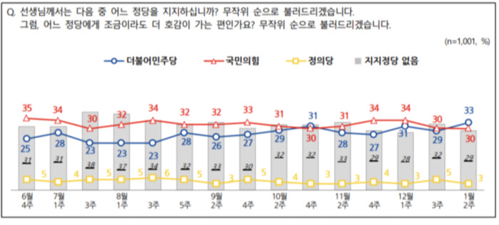정당 지지도의 경우 더불어민주당이 33%, 국민의힘이 30%를 기록했고 태도 유보는 29%였다.