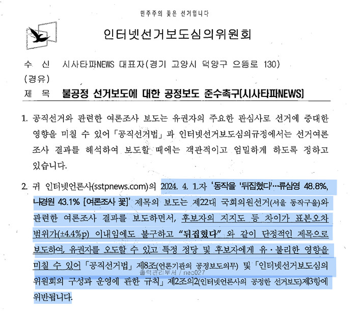위원회는 "제22대국회의원선거 (서울동작구을)와 관련한 여론조사결과를 보도하면서, 후보자의 지지도 등 차이가 표본오차 범위가(±4.4%p) 이내임에도 불구하고 "뒤집혔다" 와같이 단정적인 제목으로 보도하여, 유권자를 오도할 수 있고 특정정당 및 후보자에게 유·불리한 영향을 미칠수 있어 「공직선거법」제8조(일류기관의공정보도의무) 및 「인터넷선거보도심의 위원회의 구성과 운영에 관한 규칙」 제2조의2 (인터넷언론사의 공정한 선거보도) 제3항에 위반된다"고 지적했다.