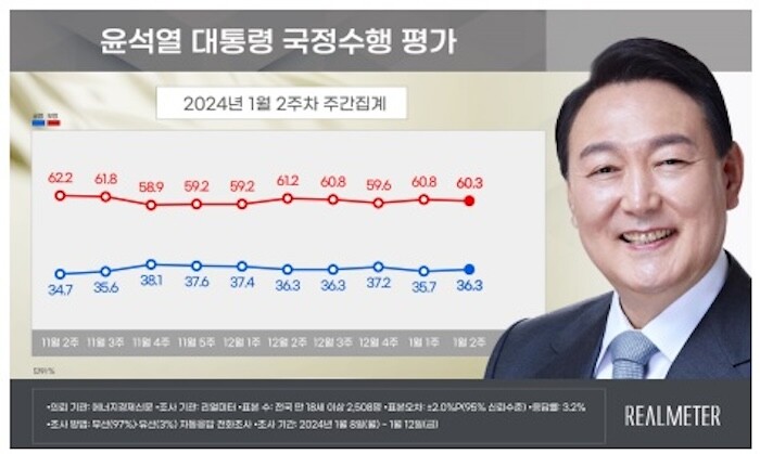 리얼미터가 에너지경제신문 의뢰로 지난 8∼12일(1월 2주차) 전국 18세 이상 2천508명을 대상으로 조사한 결과, 윤 대통령 국정 수행 지지도는 직전 조사(1월 2∼5일)보다 0.6%포인트(p) 오른 36.3%로 집계됐다.