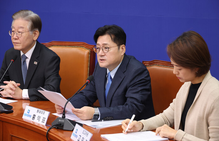 홍 원내대표는 앞서 국회에서 열린 최고위원회의에서 "정부·여당의 반대와 방해로 민생·인권·민주주의 법안이 국회에 묶여 있다"며 '노란봉투법'(노동조합 및 노동관계조정법 개정안)과 방송 3법 처리 의지를 재차 강조했다.
