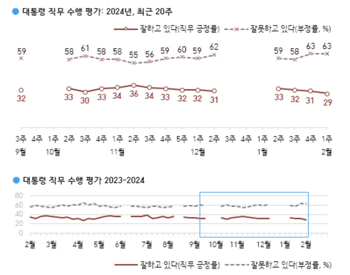 긍정평가는 직전 조사(1월 23∼25일)보다 2%포인트(p) 하락(31%→29%)했고, 부정 평가는 동률을 유지했다.