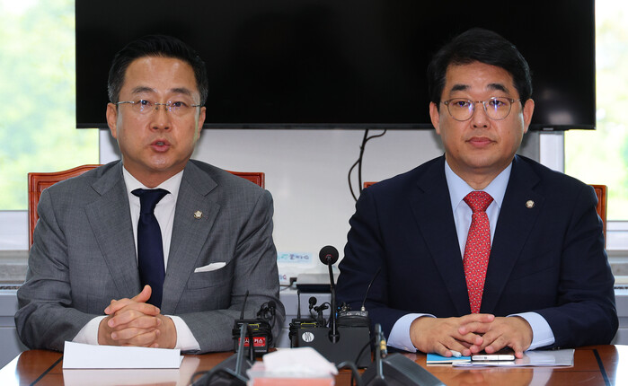 | ▲박성준 더불어민주당 원내수석부대표와 배준영 국민의힘 원내수석부대표 (사진=연합뉴스) |