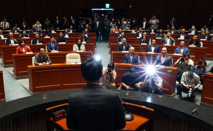 국민의힘 한동훈 대표는 25일 취임 후 처음으로 당 소속 의원 전원이 모인 의원총회에 참석해 인사를 나누며 상견례를 했다.
