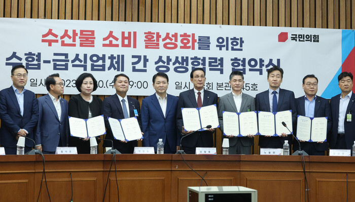 | ▲수협과 급식업체의 수산물 소비 활성화 위한 협약식 (사진=연합뉴스) |