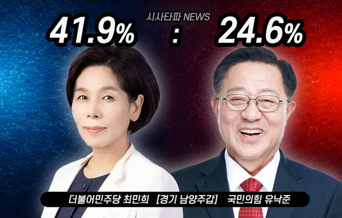 여론조사 꽃이 조사한 남양주갑 가상대결에서 최민희 더불어민주당 후보가 유낙준 국민의힘 후보를 오차 범위내에서 크게 앞서는 결과를 나타냈다.