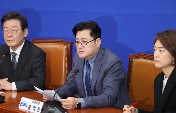 더불어민주당 홍익표 원내대표는 26일 중대재해처벌법 유예 법안이 전날 국회 본회의에서 처리되지 않은 것과 관련해 "정부·여당은 지난 2년간 허송세월해 놓고 어떤 책임 의식도 없이 그저 유예만 해달라고 한다"며 여권의 책임을 물었다.