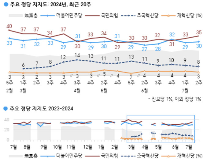 정당 지지도는 국민의힘 35%, 더불어민주당 30%, 조국혁신당 8%, 개혁신당 3%, 진보당 1%, 기타 1%의 순으로 조사됐고 무당층은 22%로 나왔다.