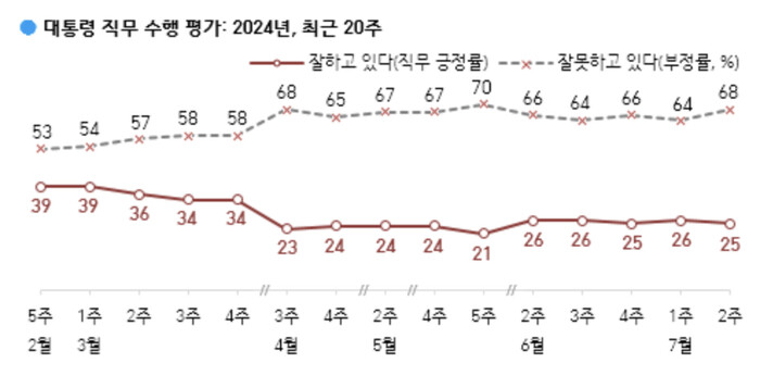 한국갤럽이 2024년 7월 둘째 주(9~11일) 전국 만 18세 이상 유권자 1,000명에게 윤석열 대통령이 현재 대통령으로서의 직무를 잘 수행하고 있다고 보는지 잘못 수행하고 있다고 보는지 물은 결과, 25%가 긍정 평가했고 68%는 부정 평가했다.
