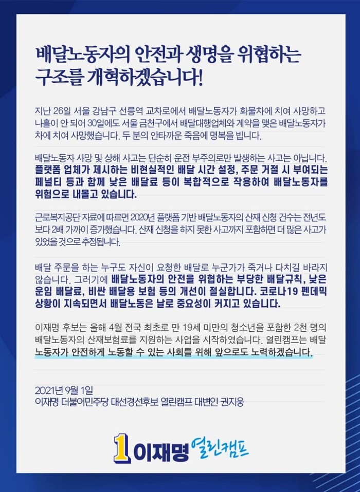 이재명 후보는 올해 4월 전국 최초로 만 19세 미만의 청소년을 포함한 2천 명의 배달노동자의 산재보험료를 지원하는 사업을 시작하였습니다. 열린캠프는 배달 노동자가 안전하게 노동할 수 있는 사회를 위해 앞으로도 노력하겠습니다.