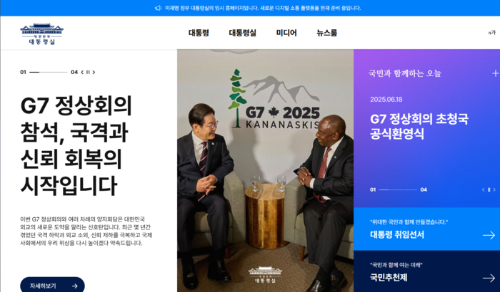이재명 대통령이 취임한 지 15일 만에 대통령실 홈페이지가 새 단장을 마쳤다. 정식 개통 전까지 한시적으로 운영되지만 국민주권정부라는 국정철학에 맞춰 직접 소통하는 창구를 서둘러 마련했다.