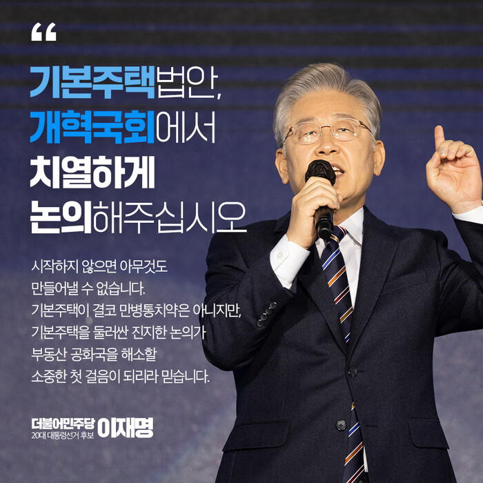 이재명 더불어민주당 대선후보는 "기본주택에 대한 법안발의" 를 국회에 강력히 요구하였다.