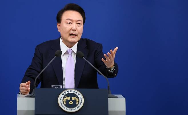 윤석열 대통령이 7일 서울 용산 대통령실에서 대국민 담화·기자회견을 열고 민주당을 강하게 비판했다.