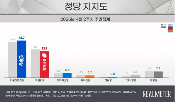 4월 1주 차 조사와 비교하면 더불어민주당은 1.9%p 상승한 반면 국민의힘은 2.6%p 하락했다. 이로써 양당 간 격차는 13.4%p로 오차범위 밖을 유지했다.