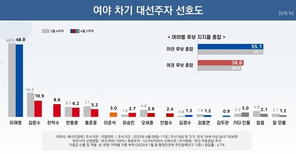 여론조사 전문기관 리얼미터는 에너지경제신문 의뢰로 지난 9~11일 전국 18세 이상 유권자 3만2383명에게 통화를 시도해 1506명이 응답을 마친 차기 대선 후보 적합도 조사에서 이재명 전 더불어민주당 대표 48.8%, 김문수 전 고용노동부 장관 10.9%, 한덕수 대통령 권한대행 8.6%, 한동훈 전 국민의힘 대표 6.2%, 홍준표 전 대구시장 5.2%, 이준석 개혁신당 의원, 유승민 전 의원, 오세훈 서울시장 2.6%, 안철수 국민의힘 2.4%, 김경수 전 경남지사 1.3%, 김동연 경기도지사 1.2%, 김두관 전 의원 0.9%로 나타났다.