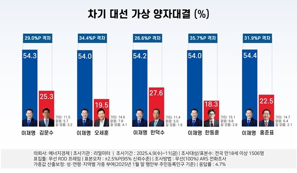양자 대결에서는 이재명 54.3% vs. 김문수 25.3%, 이재명 54.0% vs. 오세훈 19.5%, 이재명 54.2% vs. 한덕수 27.6%, 이재명 54.0% vs. 한동훈 18.3%, 이재명 54.4% vs. 홍준표 22.5%로 이재명이 절반을 넘는 지지율을 보이며 여당 후보들을 압도했다.