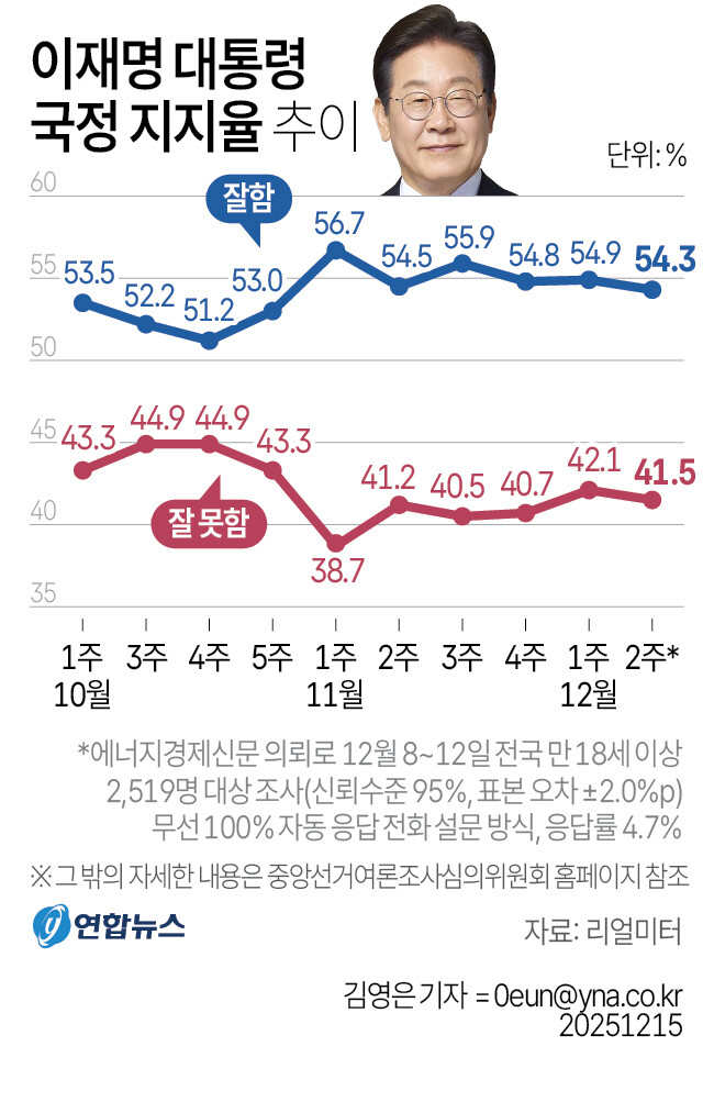 여론조사 전문기관 리얼미터가 에너지경제신문 의뢰로 지난 8~12일 전국 18세 이상 유권자 2519명을 대상으로 실시한 조사 결과, 이재명 대통령의 국정 수행 긍정 평가는 54.3%, 부정 평가는 41.5%로 집계됐다. 전주 대비 긍정·부정 평가 모두 0.6%p씩 하락해 지지도 흐름은 사실상 유지됐다.