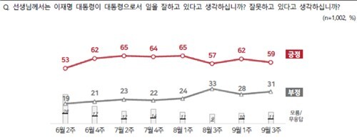 18일 엠브레인퍼블릭, 케이스탯리서치, 코리아리서치, 한국리서치에 따르면, 지난 15~17일 전국 성인 1천2명을 대상으로 실시된 전국지표조사(NBS) 결과 이 대통령 지지율은 2주 전보다 3%포인트 낮아진 59%를 기록했다. 이는 2주 전 5%포인트 급등하며 60%대를 회복했다가 다시 하락한 수치다.