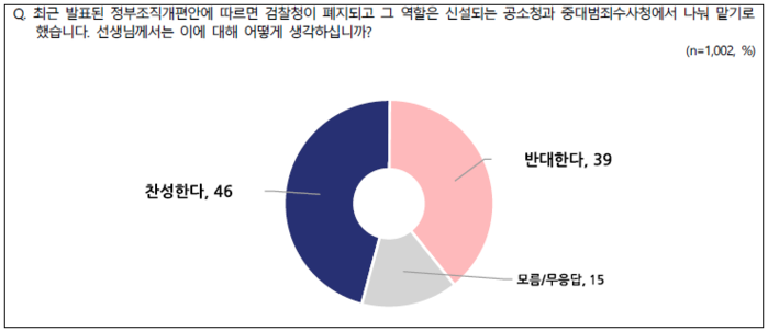 검찰청을 폐지하고 공소청과 중대범죄수사청으로 역할을 분담하는 정부조직개편안에 대해서는 찬성 46%, 반대 39%로 나타났다. 3050대에서는 찬성이 높았으나, 1829세와 70세 이상에서는 반대가 더 높았다.